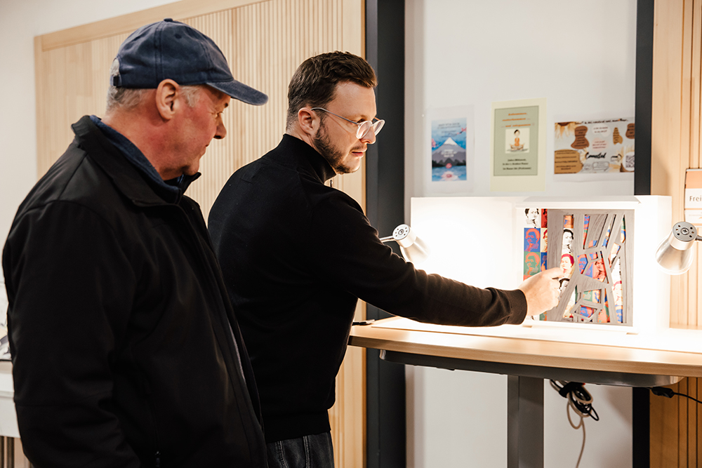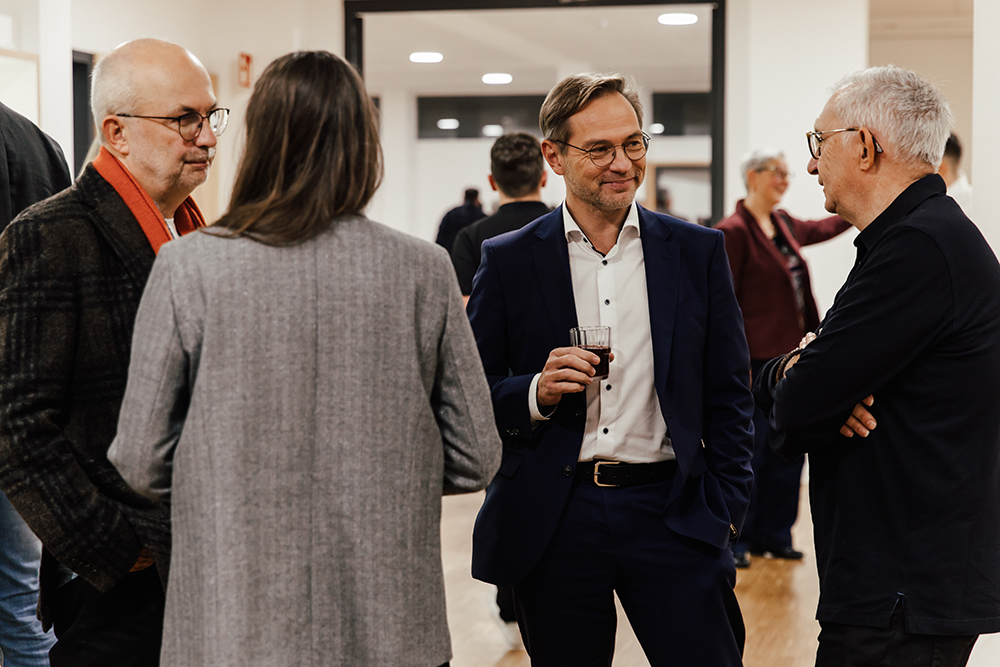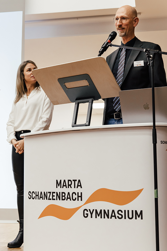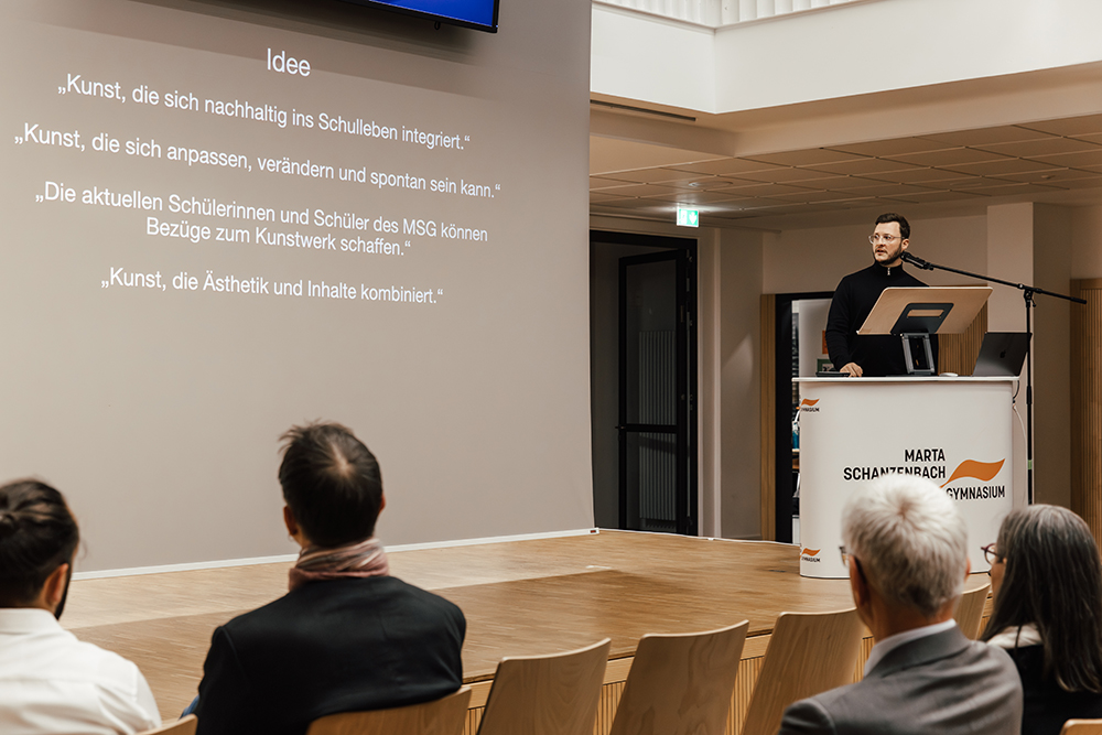 Die Einführung in das Projekt „Kunst am Bau am MSG“ erfolgte durch die Initiatoren, vertreten durch Martin Eitel. Im Anschluss stellte Jonas Göhringer, Lehrer und ehemaliger Schüler am MSG, die Projektidee genauer vor. Gemeinsam mit seinem Vater, dem renommierten Künstler Armin Göhringer, sowie mit Schüler*innen unserer Schule soll eine Wand im Eingangsbereich mit einem Kunstwerk gestaltet werden. In der Projektvorstellung wurde deutlich, dass hier verschiedene künstlerische Ansätze zusammengeführt werden: eine Kunst, die sich nachhaltig ins Schulleben integriert, sich verändert und an neue Schülerschaften anpasst. Ziel des Projekts ist es, sowohl die künstlerische Arbeit als auch die Gemeinschaft innerhalb der Schule zu stärken.