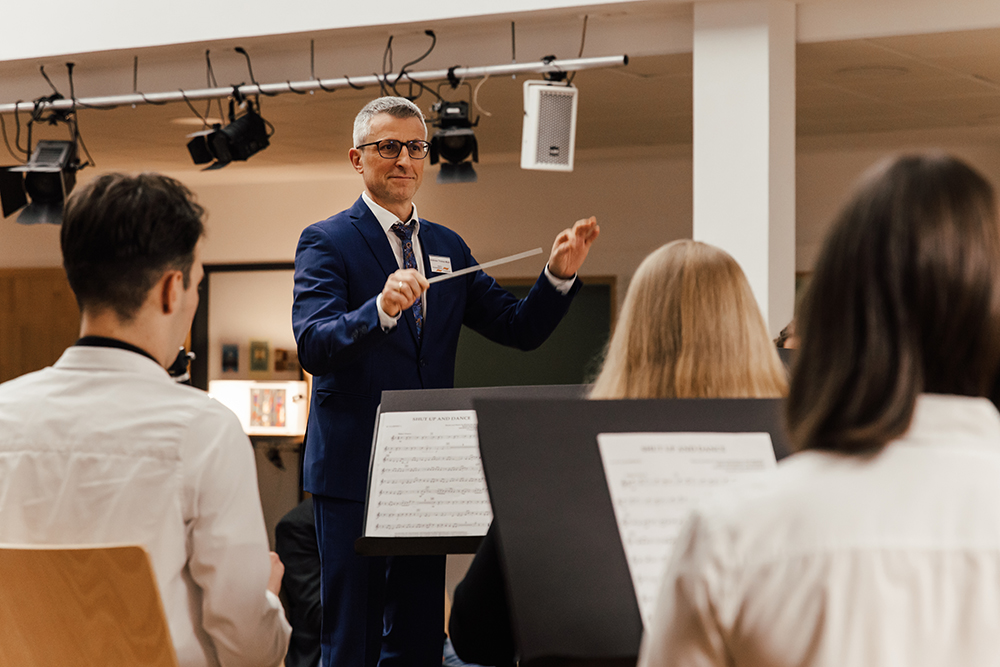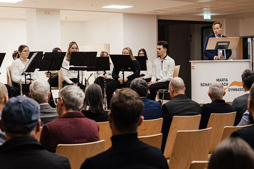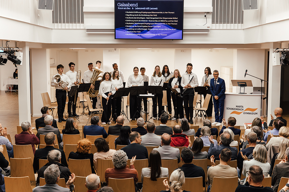 Musikalisch umrahmt von der Projektgruppe Bläserensemble unter der Leitung von Andreas Thoman, wurde die Veranstaltung feierlich eröffnet. Nach den Worten der Schulleitung richtete auch der Schulträger, Herr Bürgermeister Müller, ein Grußwort an die Gäste.