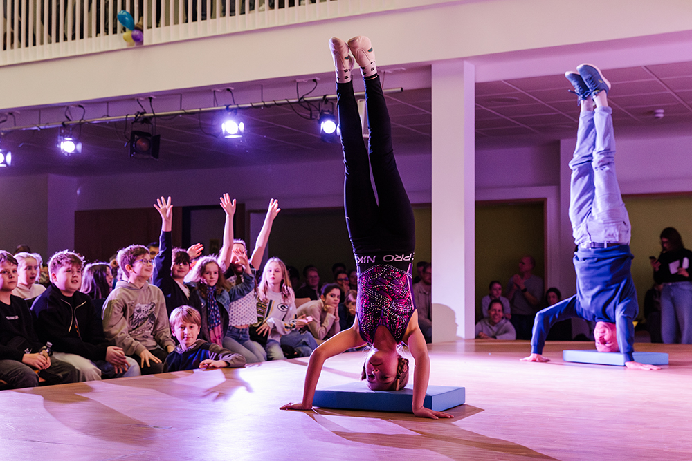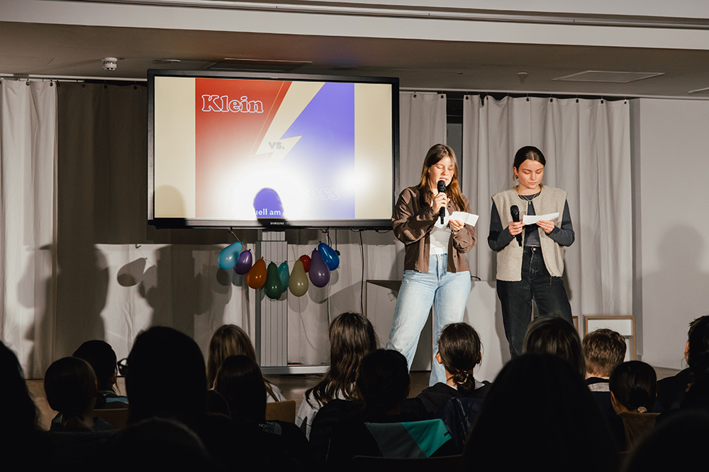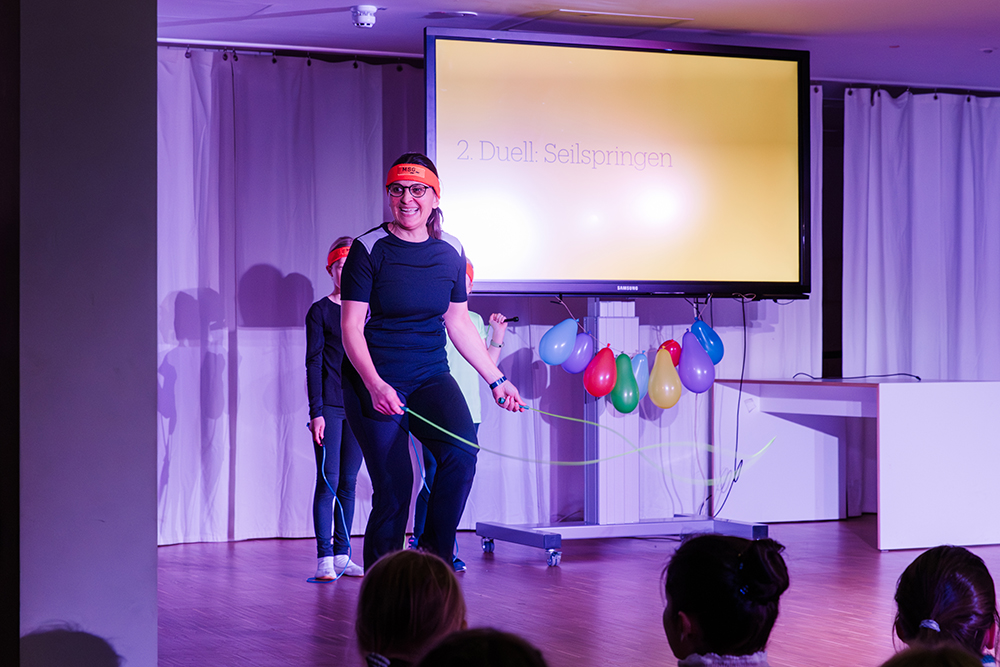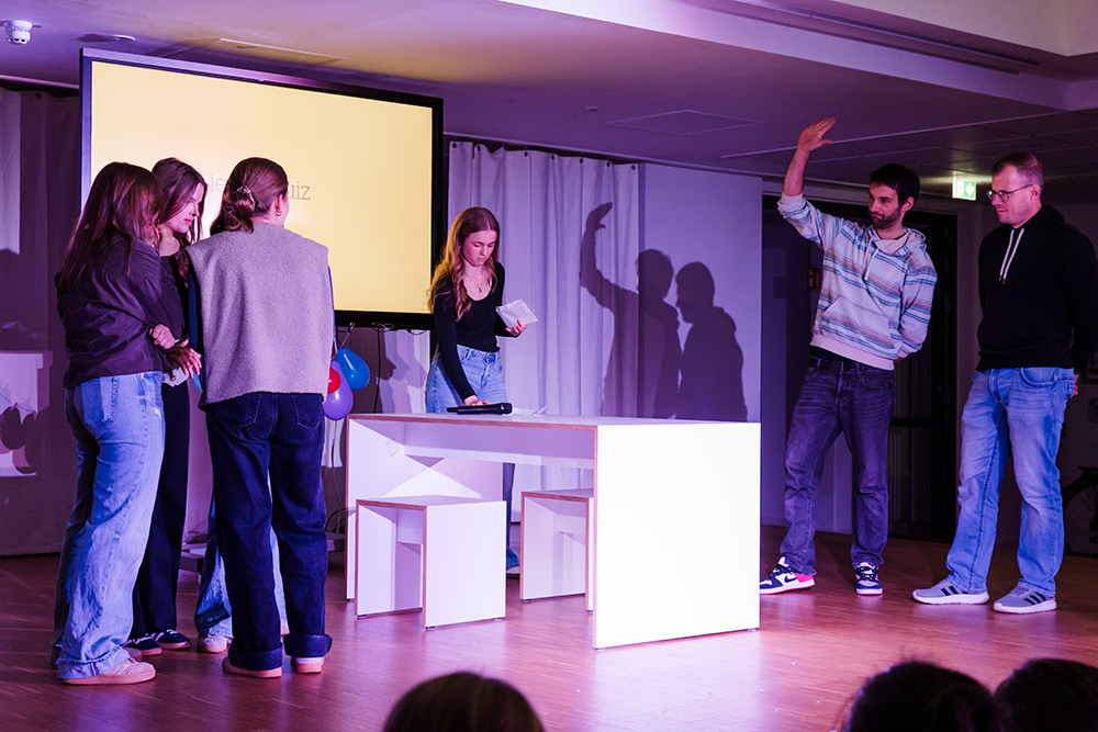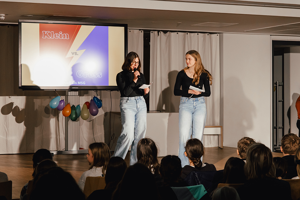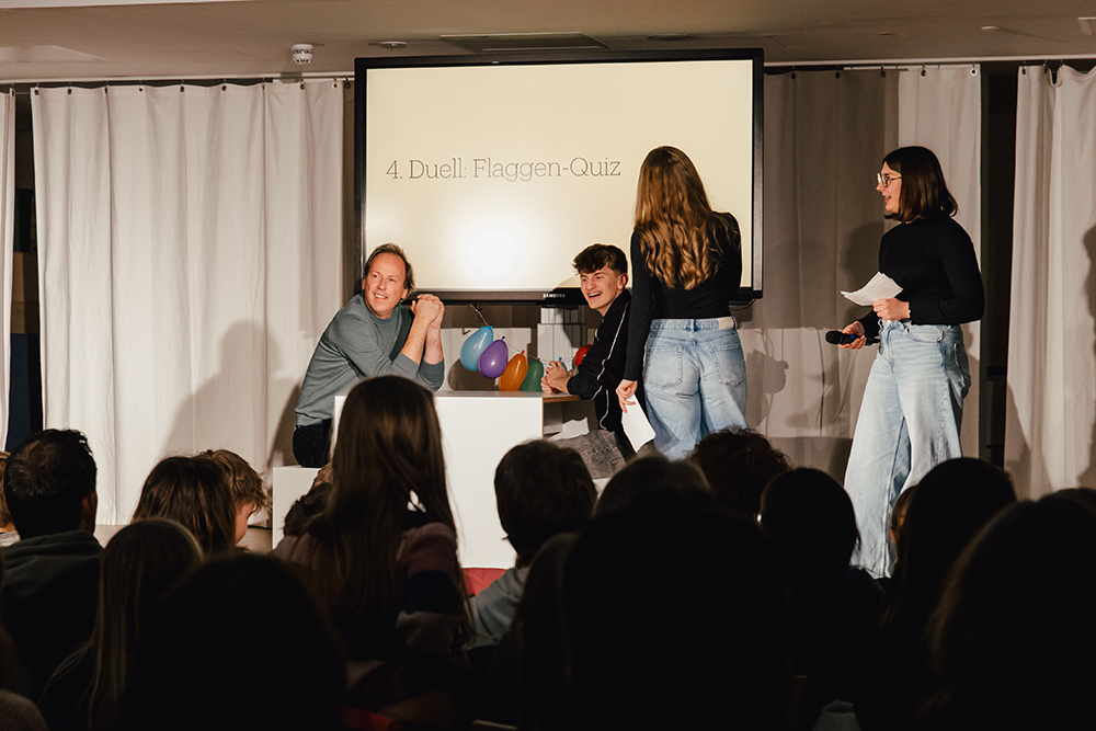 Moderiert wurde der Abend von Pia Riexinger und Anna Hoferer, die gemeinsam mit Sarah Brucher und Emily Schwer das Event auf die Beine gestellt hatten. Auf dem Programm standen unter anderem das Erraten von Flaggen, ein Kopfstand-Wettbewerb sowie ein Fünf-Kilometer-Lauf zwischen Hannes Schuler und dem KS2-Schüler Tim Proß. Ziel der Schüler*innen war es, einen hausaufgabenfreien Tag zu gewinnen, während die Lehrkräfte im Falle eines Sieges eine Kuchentheke für das Lehrerzimmer erhalten hätten.