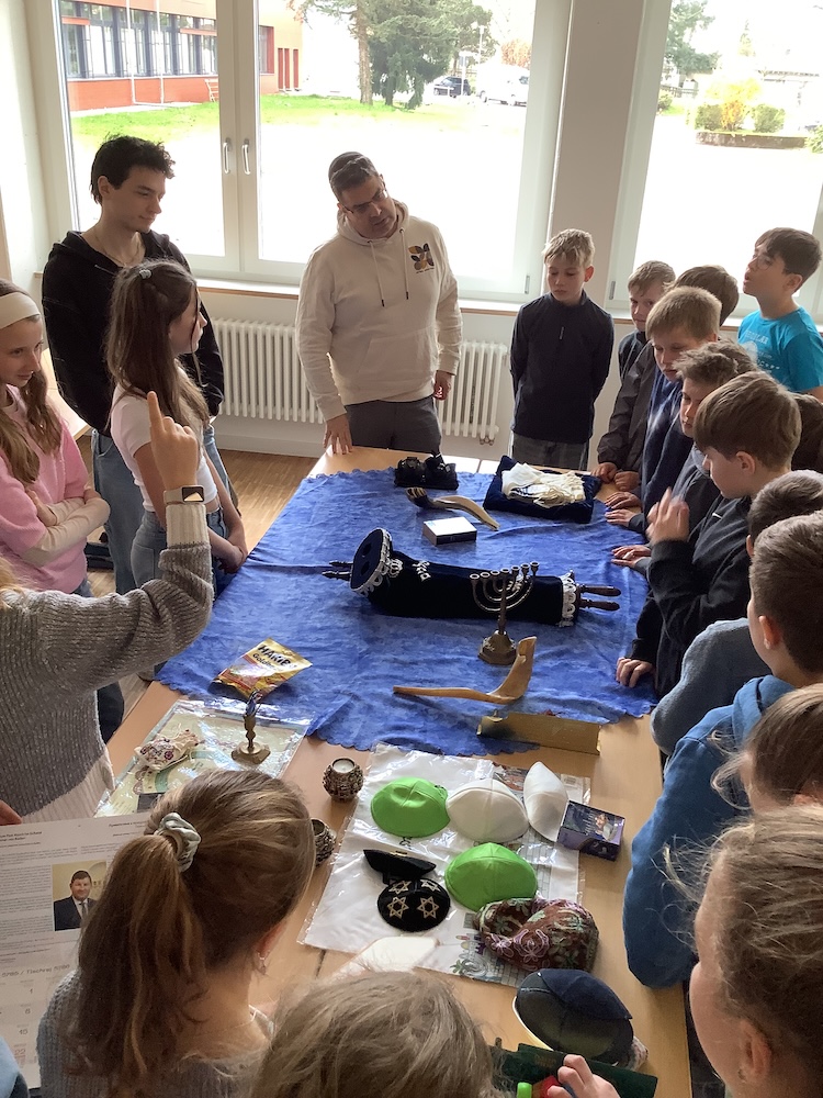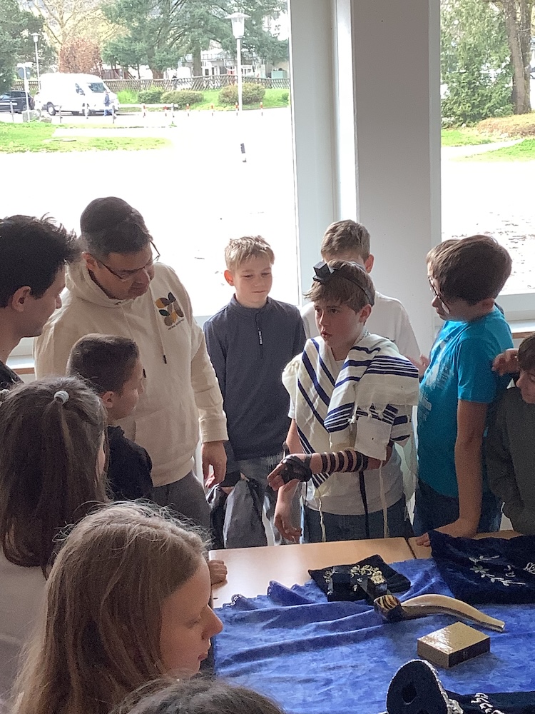 Im Rahmen des katholischen Religionsunterrichts erfuhren die Schüler*innen bereits mehr über die Gebetsrituale und Praktiken im Judentum, die ebenfalls bei den Besucher*innen nachgefragt und besprochen wurden. So erfuhren die Teilnehmenden zum Beispiel, dass Juden und Jüdinnen in der Regel drei Mal am Tag beten und der Schabbat ein wöchentlicher Ruhetag und wichtigster religiöser Tag der Woche im Judentum ist. Neben vielen Objekten z.B. Kippa und Gebetsmantel, die die jüdischen Mitbürger*innen mitgebracht hatten, probierten die Schüler*innen auch gerne die koscheren Gummibärchen, die fast wie „normale“ Gummibärchen schmeckten. Statt Gelatine vom Schwein waren diese aus Fischknochen hergestellt worden. Die Schülerinnen und Schüler erfuhren so aus erster Hand mehr über den jüdischen Glauben und seine Gebräuche und Rituale. Die Begegnung wurde im Rahmen des Schulprojekts „Schule ohne Rassismus – Schule mit Courage“ am MSG durchgeführt und soll die Schülerinnen und Schüler motivieren selbst aktiv gegen Rassismus und Antisemitismus vorzugehen. (Lie)