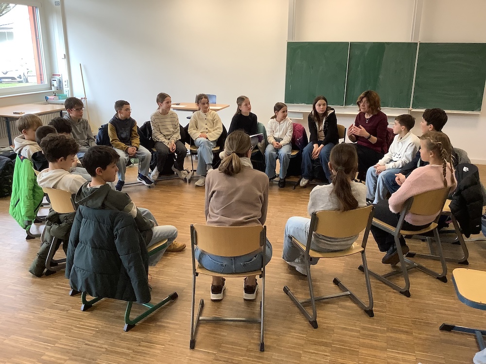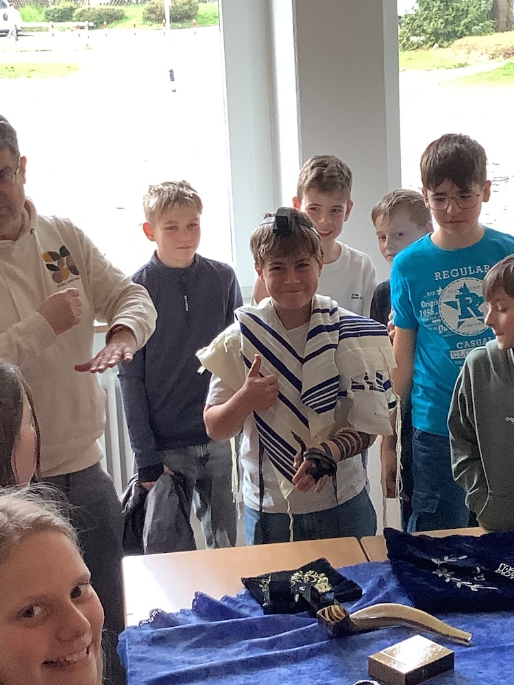 Leah, David und David sprachen über ihren jüdischen Glauben und stellten sich geduldig den Fragen der überaus interessierten Schülerinnen und Schüler der Klassen 6e und 6c. Viele Fragen bezogen sich auf den aktuellen Krieg im Nahen Osten und die aktuelle Lage vor Ort in Israel, die von den Besucher*innen anschaulich beantwortet werden konnten, da einige familiäre Bezüge dorthin haben. Daneben spielte das heutige jüdische Leben und auch die vergangene Lebenssituation von Juden und Jüdinnen in Deutschland eine zentrale Rolle in den Fragen der Schülerinnen und Schüler.